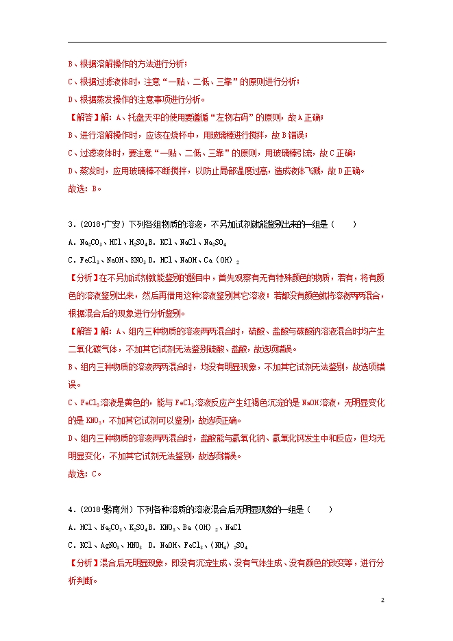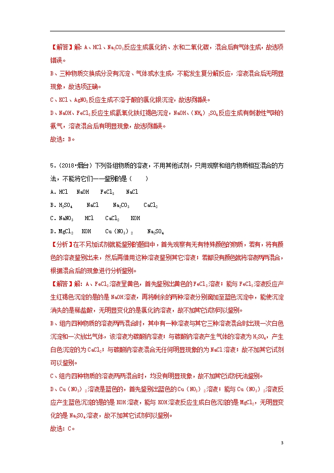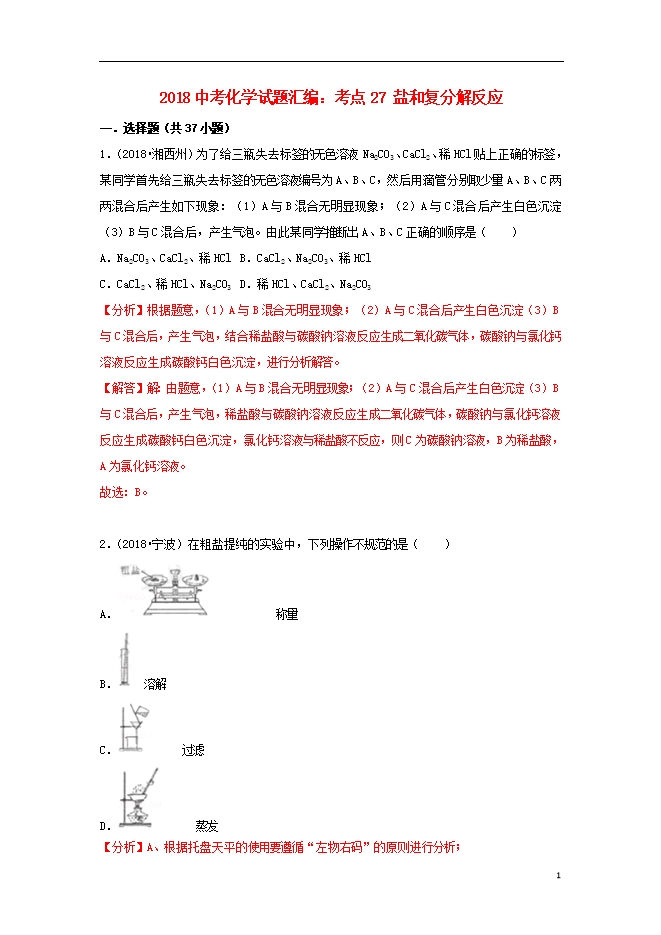 2018中考化学试题汇编(一)考点27盐和复分解反应(含解析)