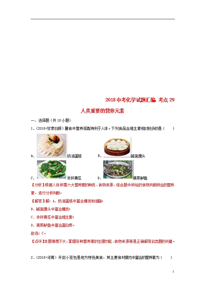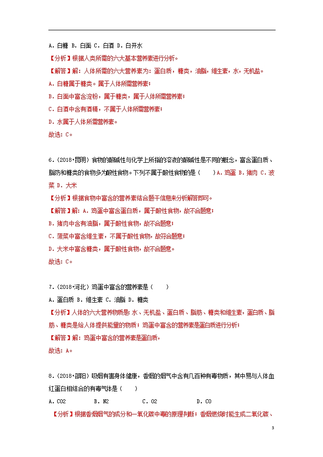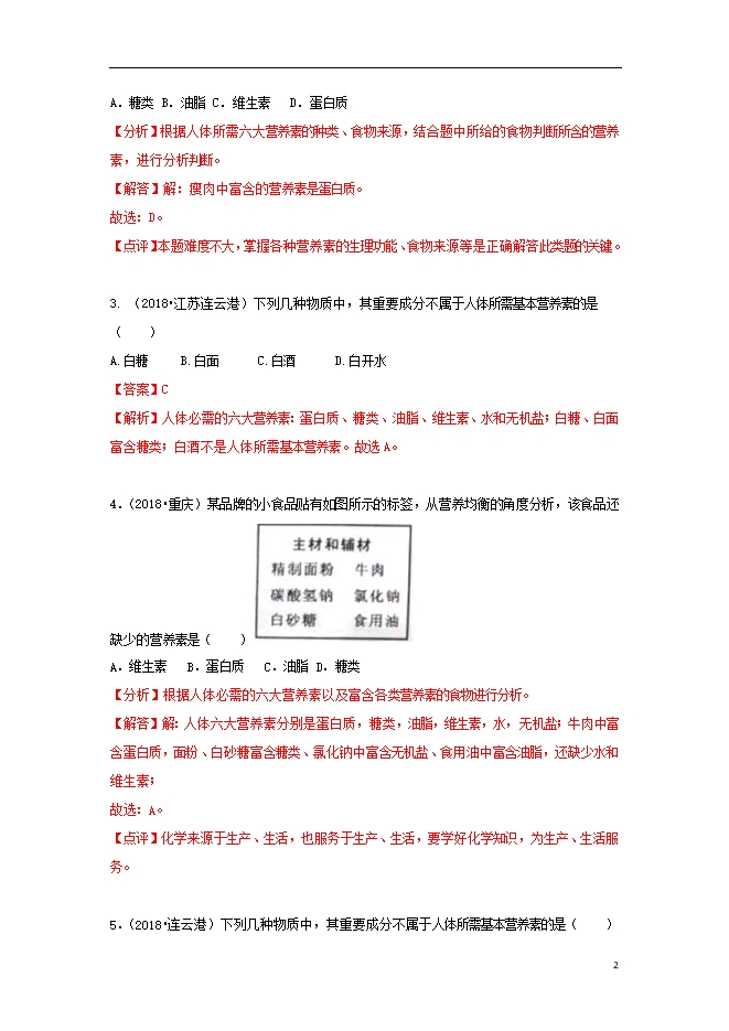 2018中考化学试题汇编(一)考点29人类重要的营养元素(含解析)