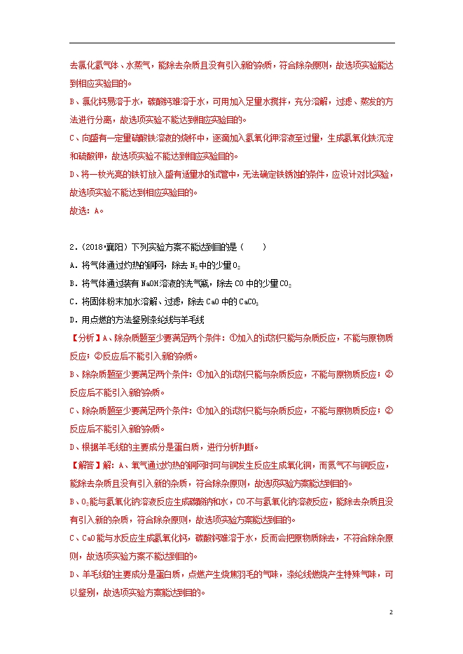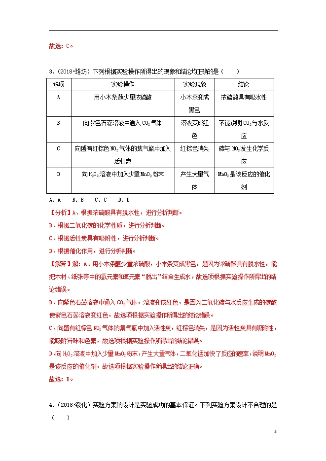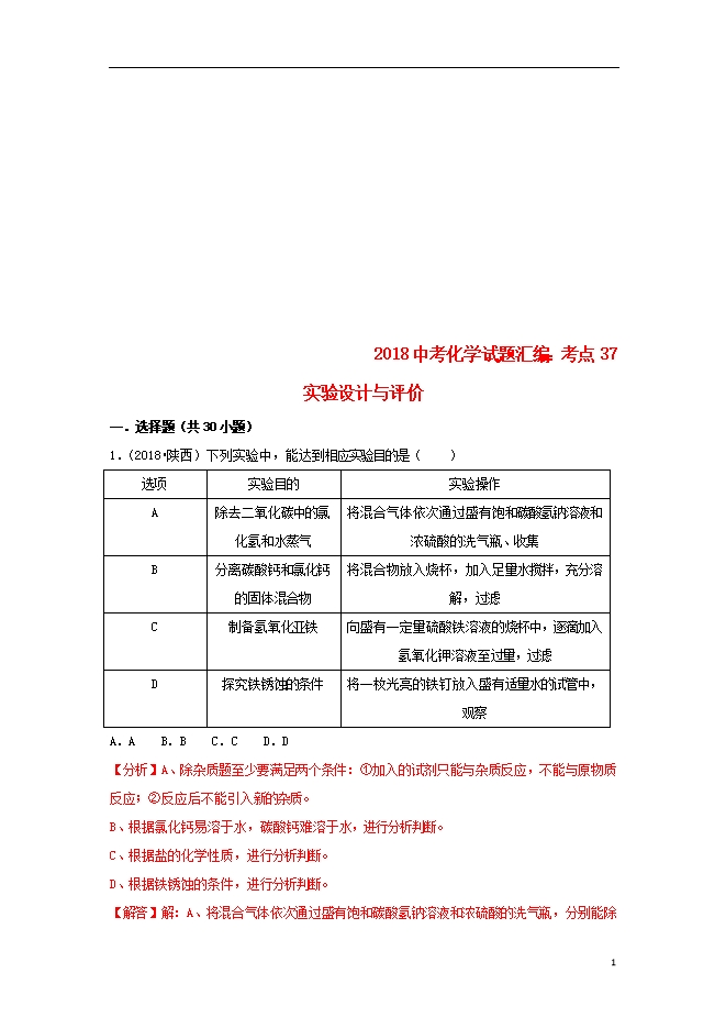 2018中考化学试题汇编(一)考点37实验设计与评价(含解析)