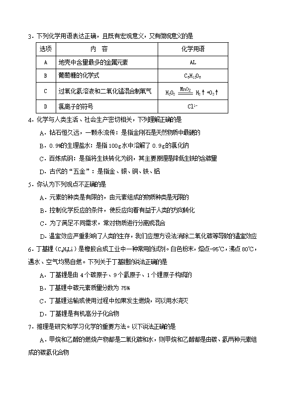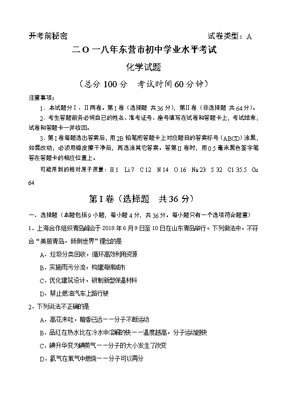 2018年山东省东营市中考化学试题及答案(word版,含答案)