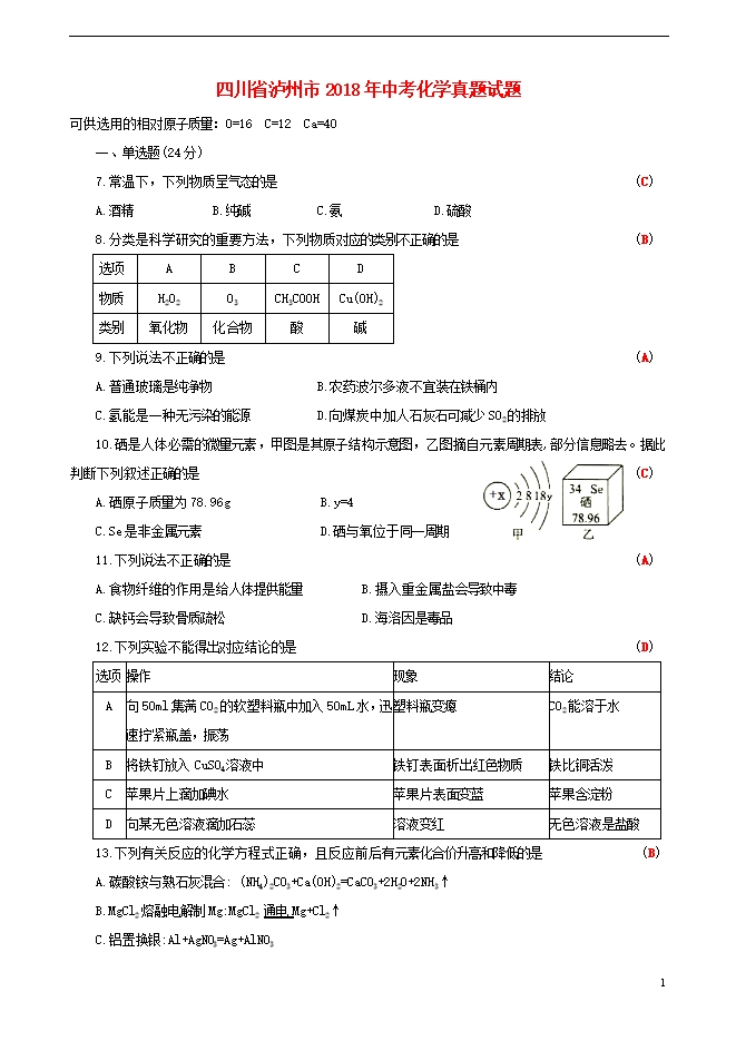 所属专辑: 《2018年各省市中考化学真题》专辑