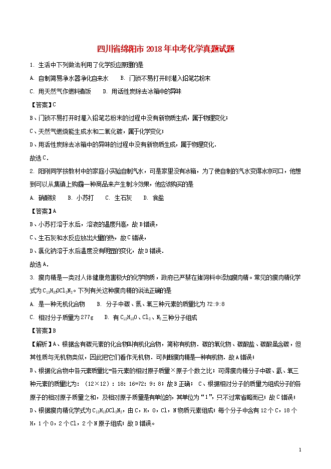 2018年四川省绵阳市中考化学试题(word版,含答案解析)