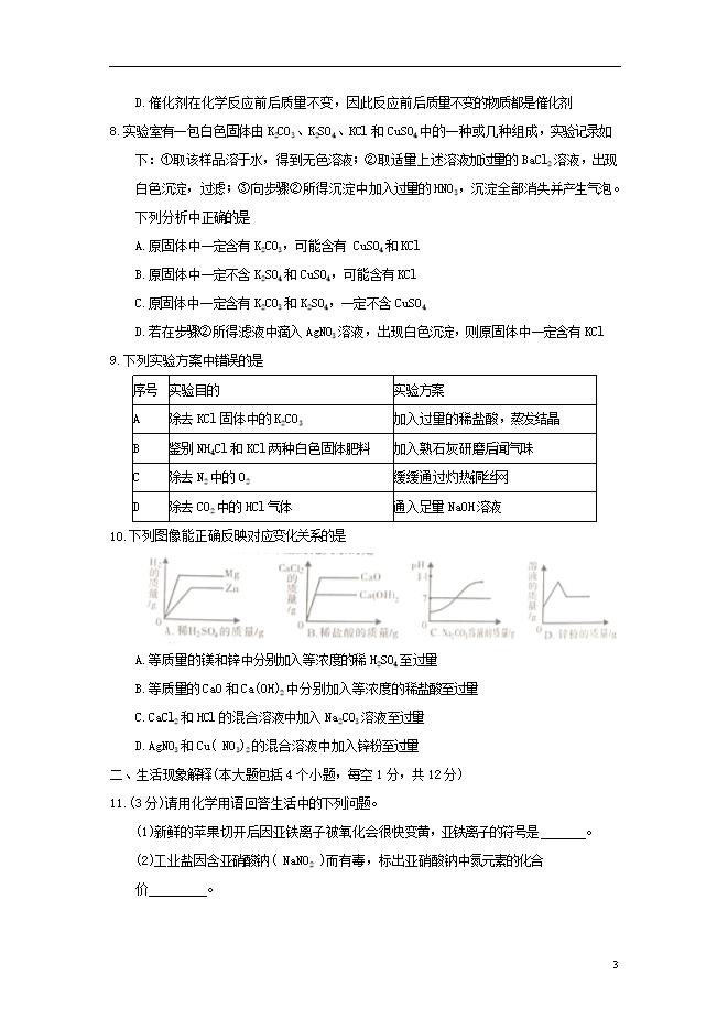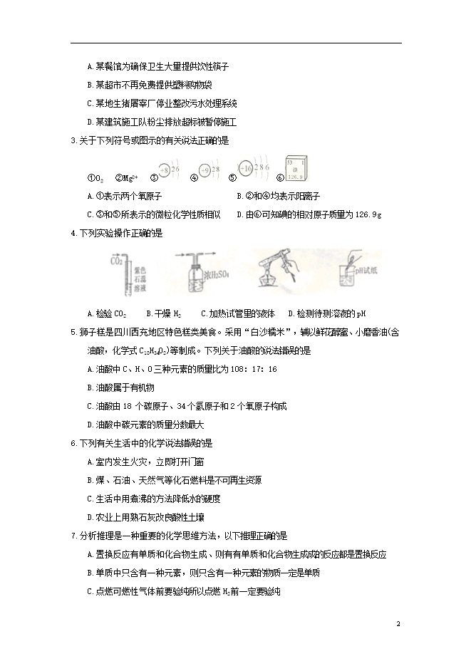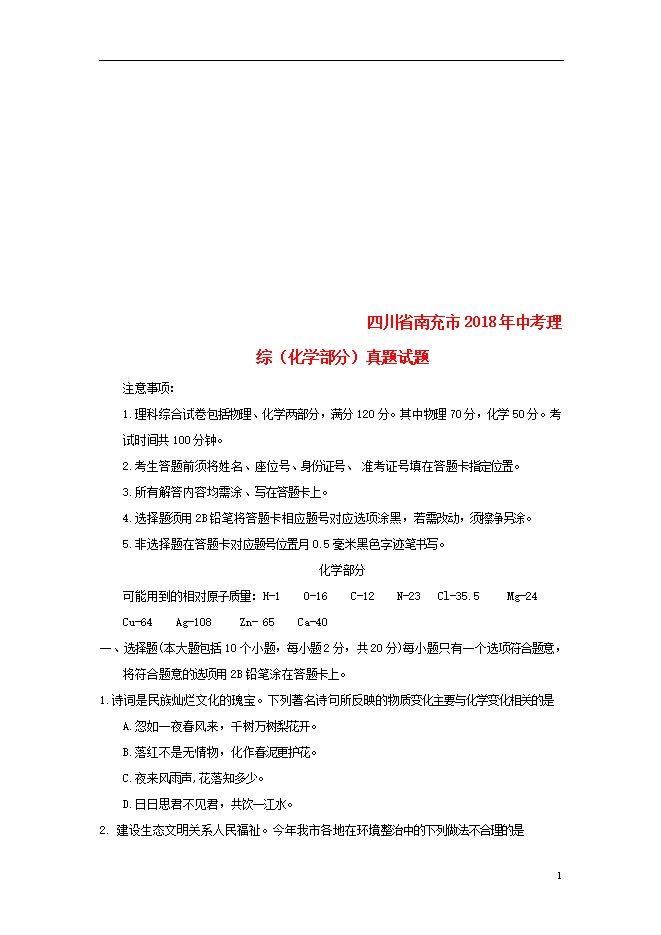 2018年四川省南充市中考化学试题(word版含答案)