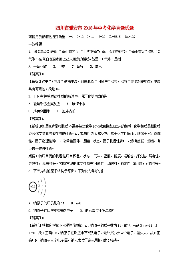 2018年四川省雅安市中考化学试题(word版,含答案解析)