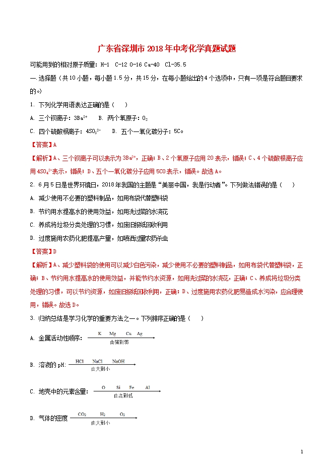 2018年广东省深圳市中考化学试题(word版,含答案解析)