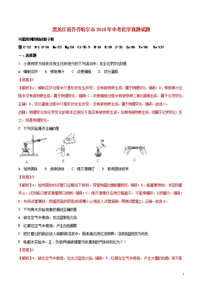 2018年黑龙江省齐齐哈尔市中考化学试题(word版,含答案解析)
