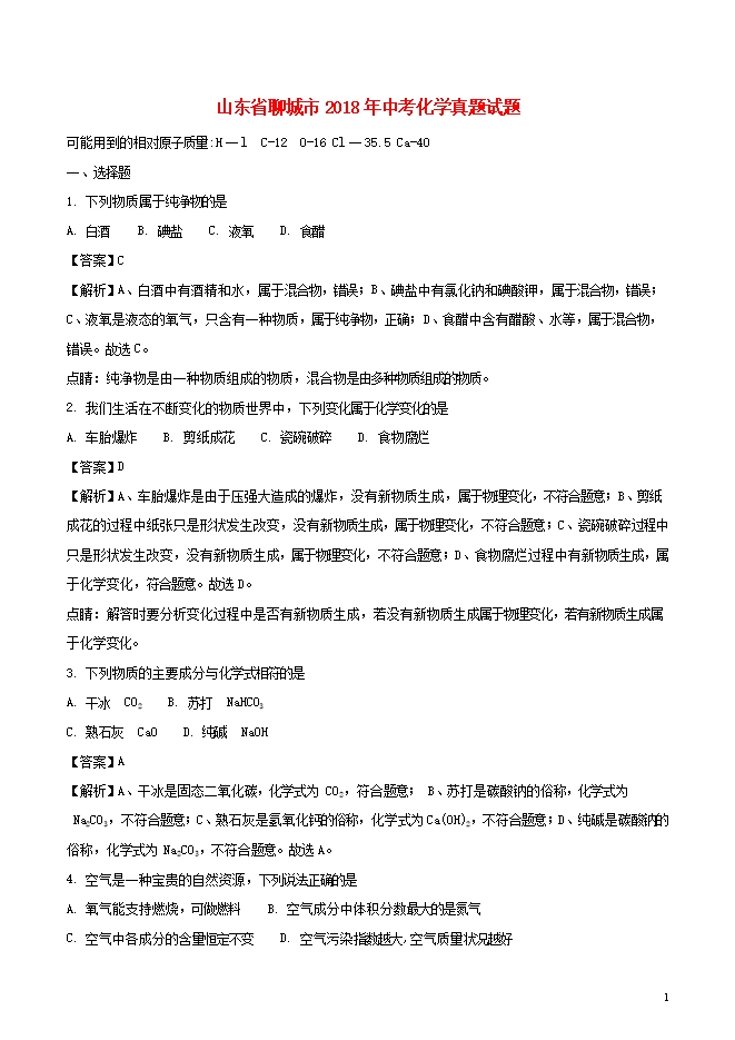 2018年山东省聊城市中考化学试题(word版,含答案解析)