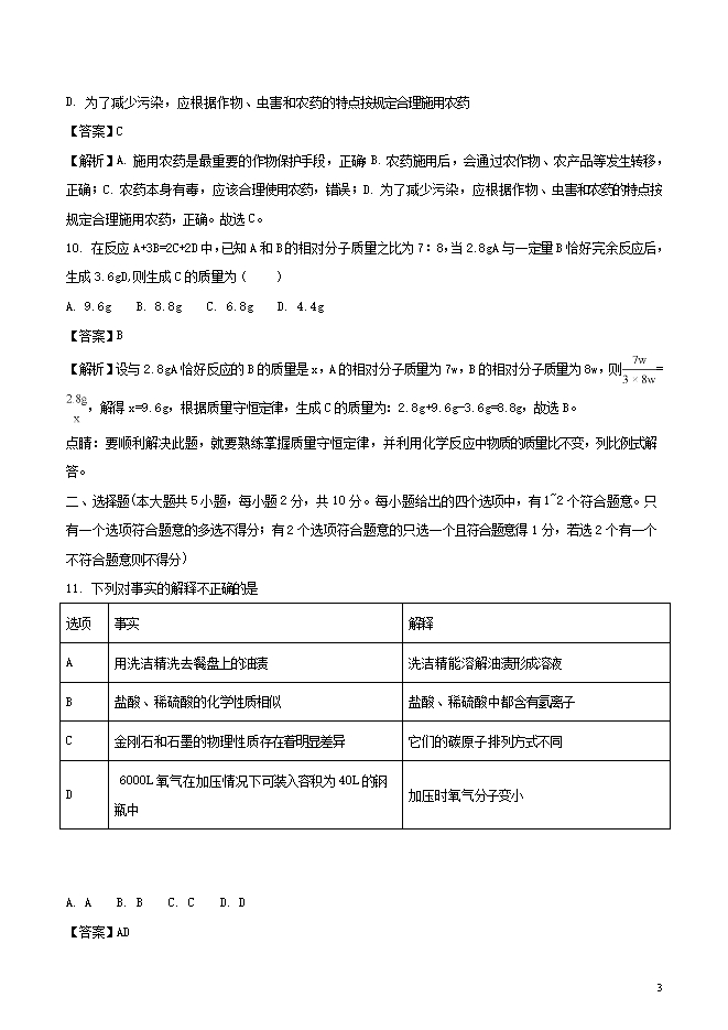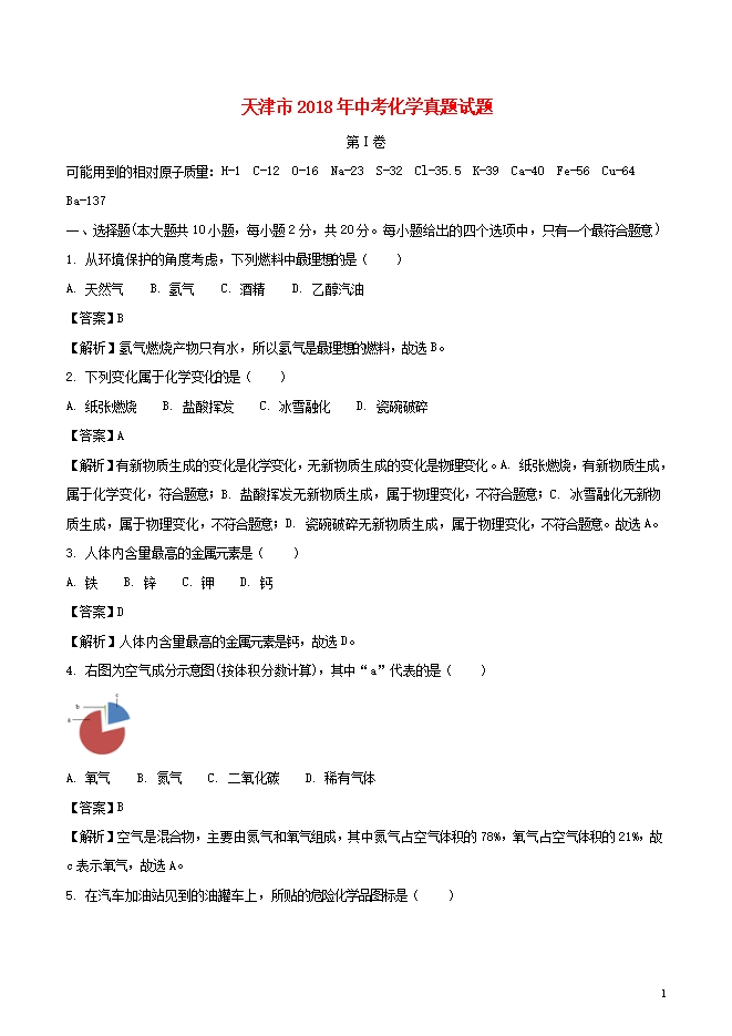 2018年天津市中考化学试题(word版,含答案解析)