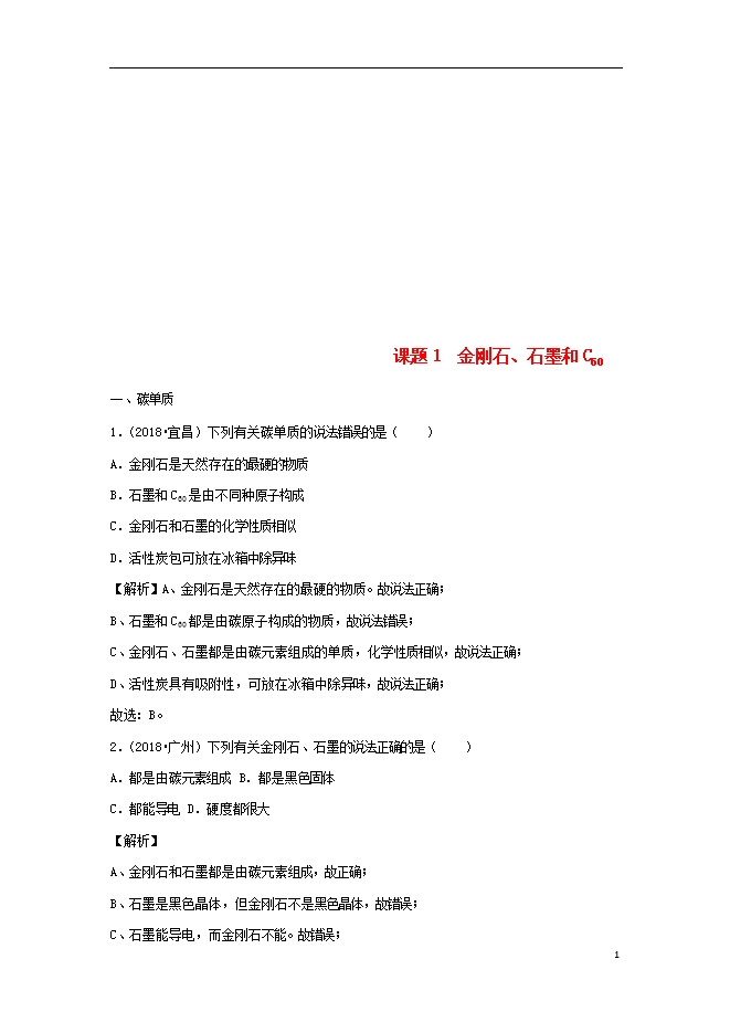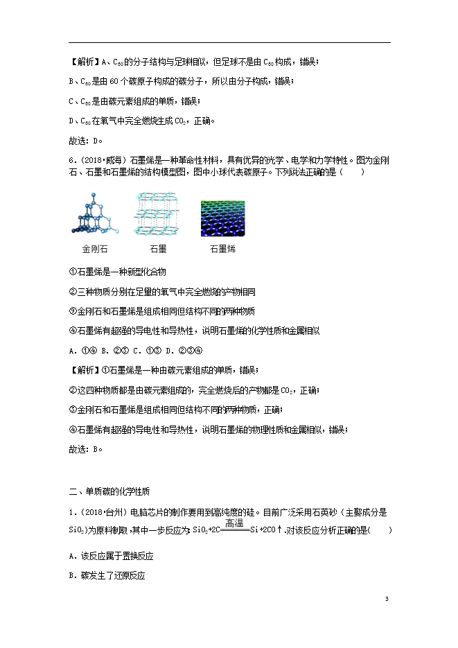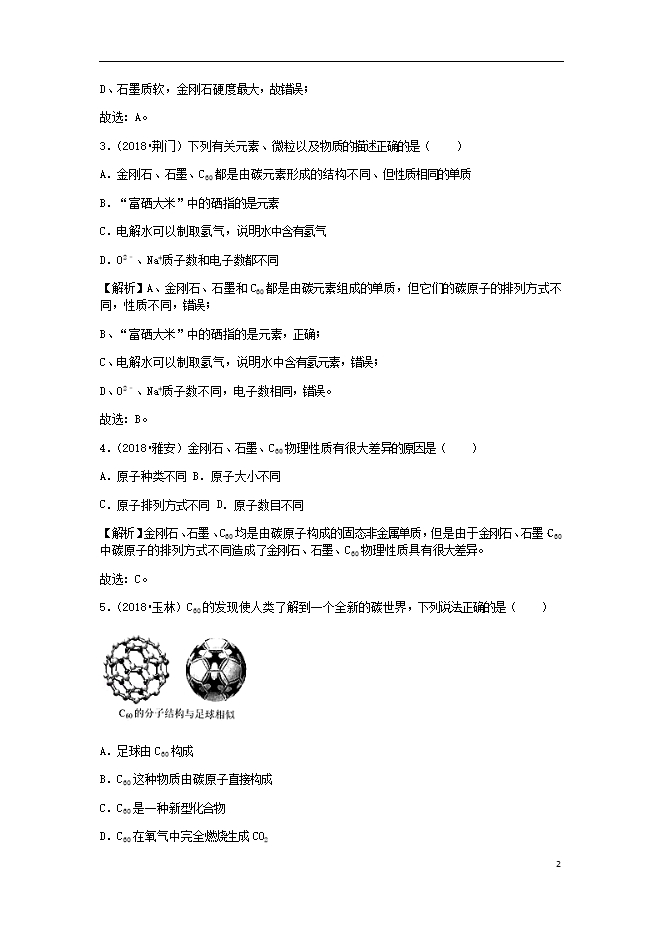 2018年中考化学真题分类汇编 (三) 新人教版《第六单元 碳和碳的氧化物课题1金刚石、石墨和C60》(含解析)