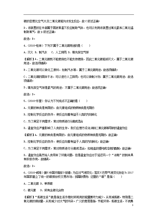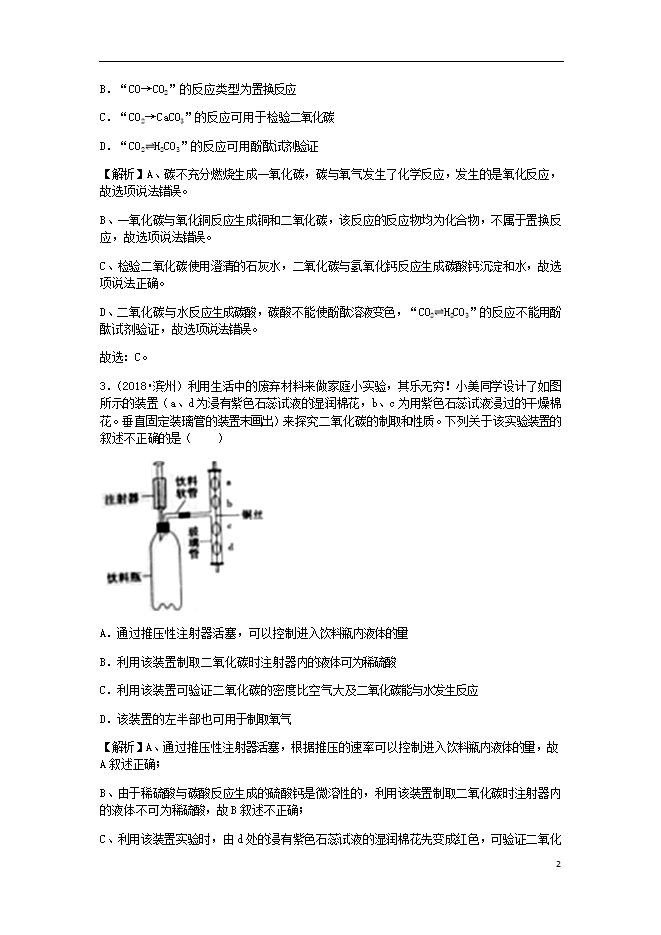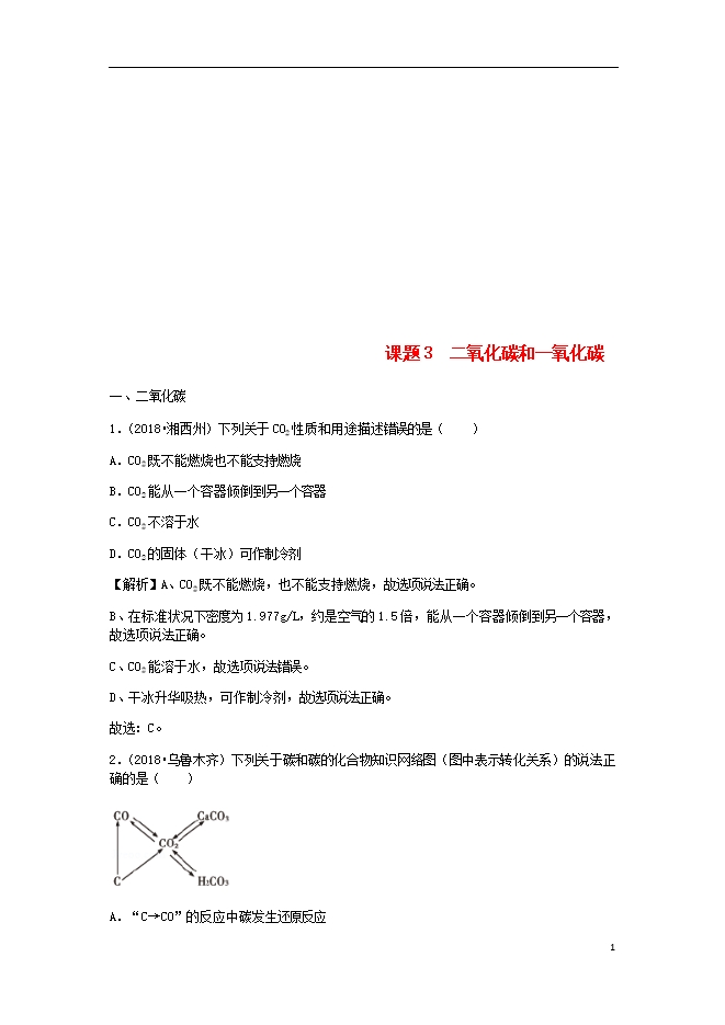 2018年中考化学真题分类汇编 (三) 新人教版《第六单元碳和碳的氧化物课题3二氧化碳和一氧化碳》(含解析)