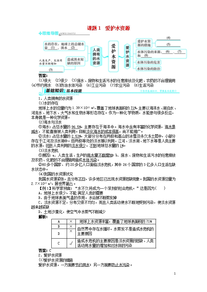 2018秋季人教版九年级化学上册《第四单元自然界的水课题1 爱护水资源》同步习题(word版,含答案解析)