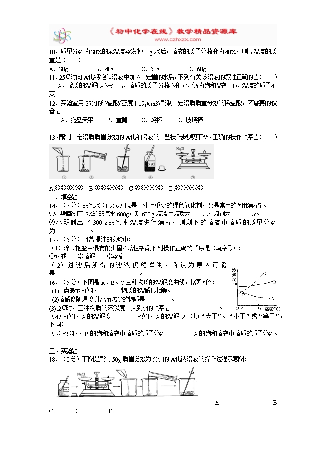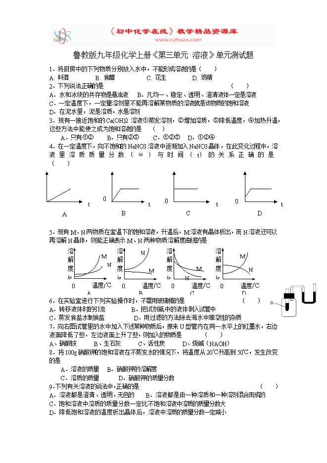 鲁教版九年级化学上册《第三单元 溶液》单元测试题(word版无答案)2