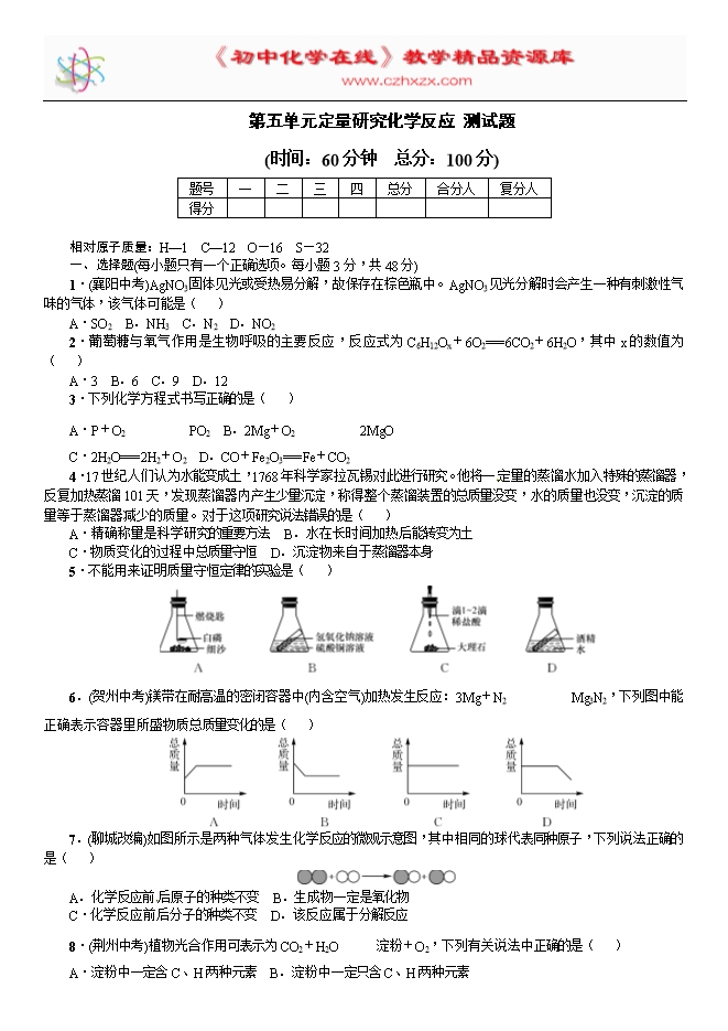 鲁教版九年级化学上册《第五单元 定量研究化学反应》单元测试题(word版含答案)