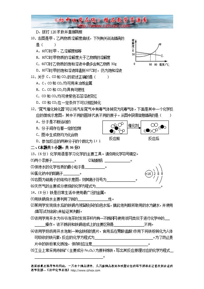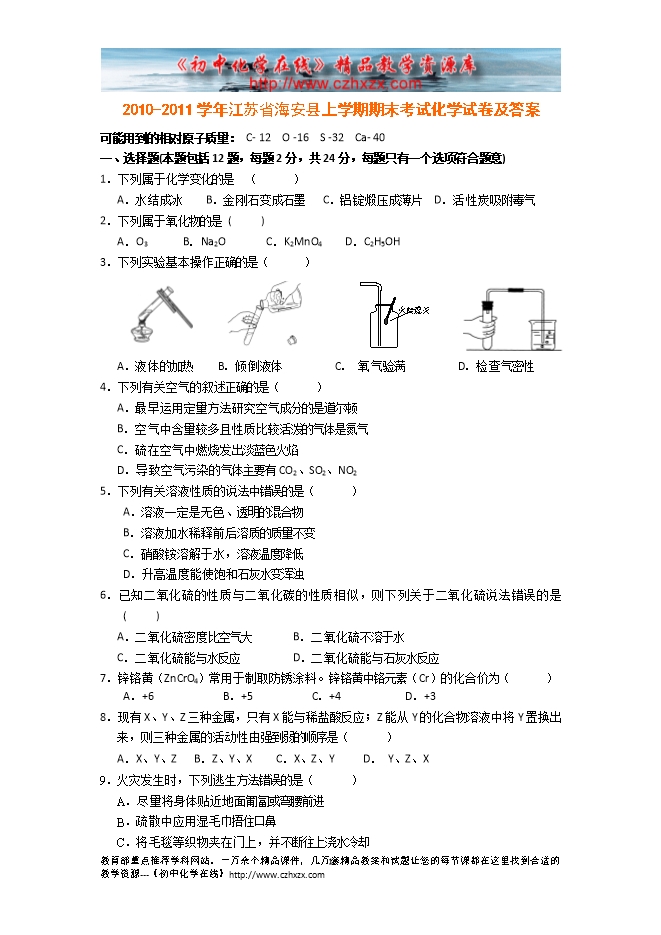 2010-2011学年江苏省海安县上学期期末考试化学试卷及答案