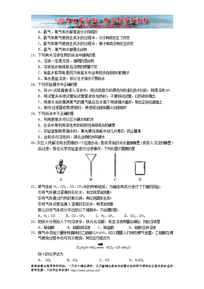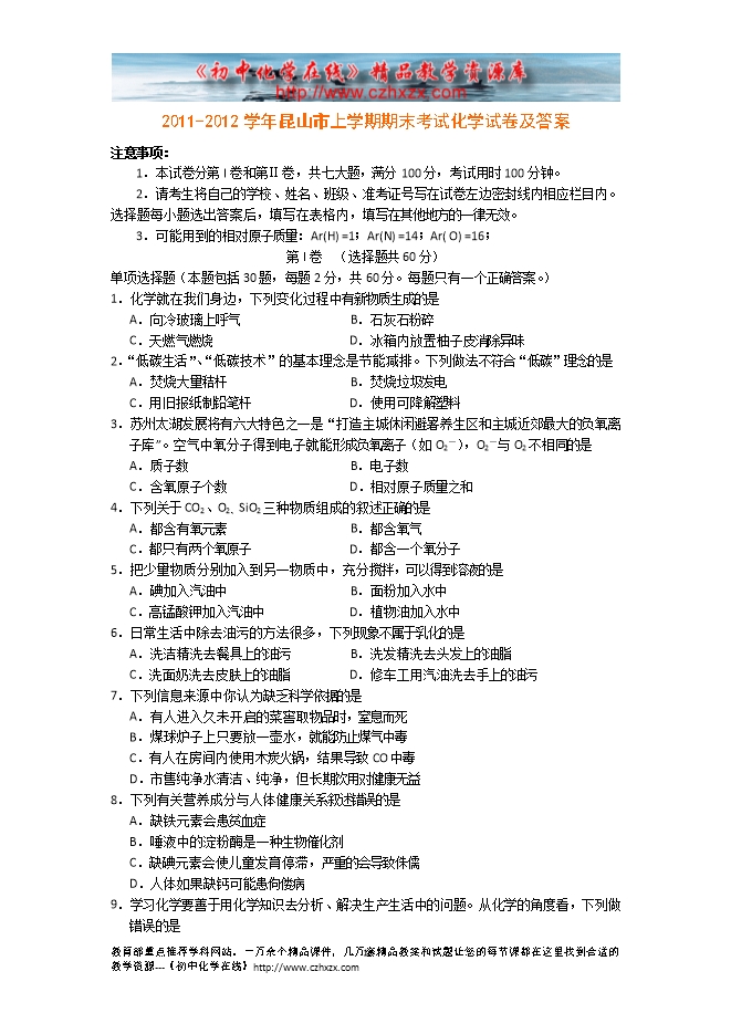 2011-2012学年江苏省昆山市上学期期末考试化学试卷及答案