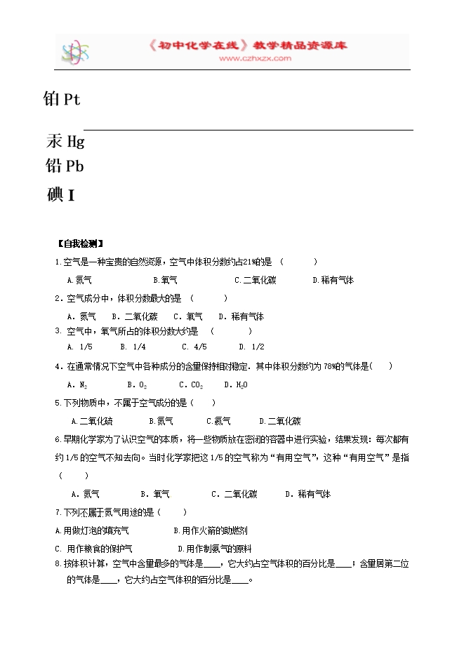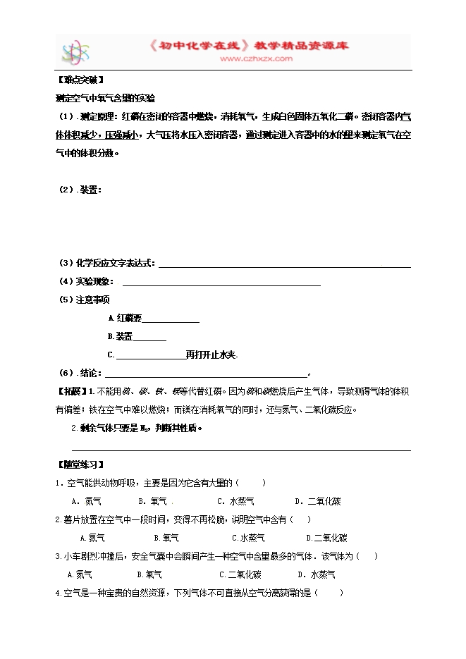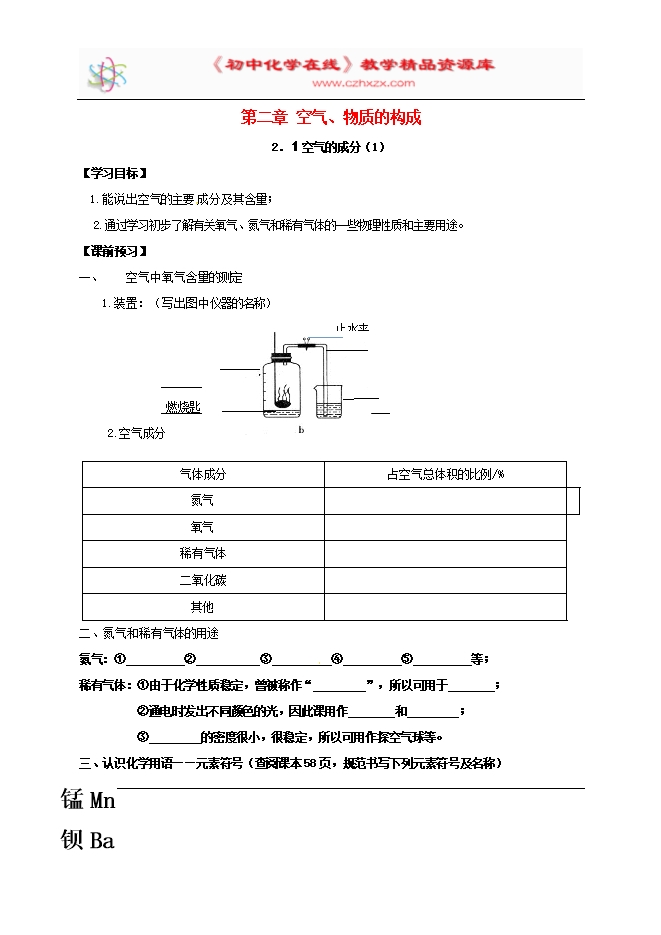 内蒙古鄂尔多斯市东胜区粤教版九年级化学上册《第二章 空气物质的构成2.1空气的成分1》学案(word版无答案)