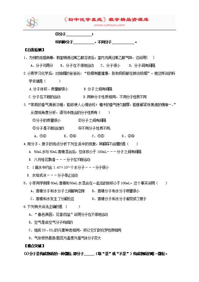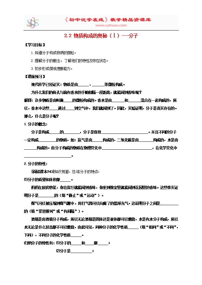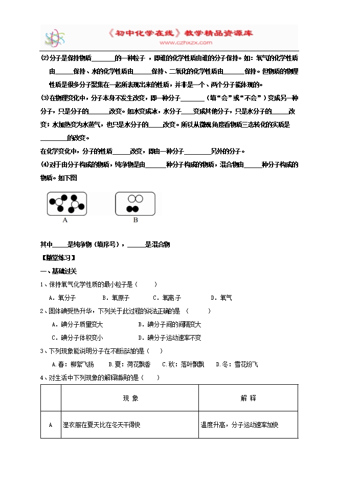内蒙古鄂尔多斯市东胜区粤教版九年级化学上册《第二章 空气物质的构成2.2物质构成的奥秘Ⅰ_分子》学案(word版无答案)