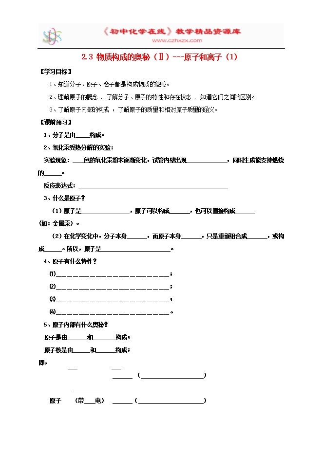 内蒙古鄂尔多斯市东胜区粤教版九年级化学上册《第二章 空气物质的构成2.3物质构成的奥秘Ⅱ_原子和离子1》学案(word版无答案)