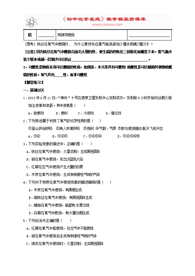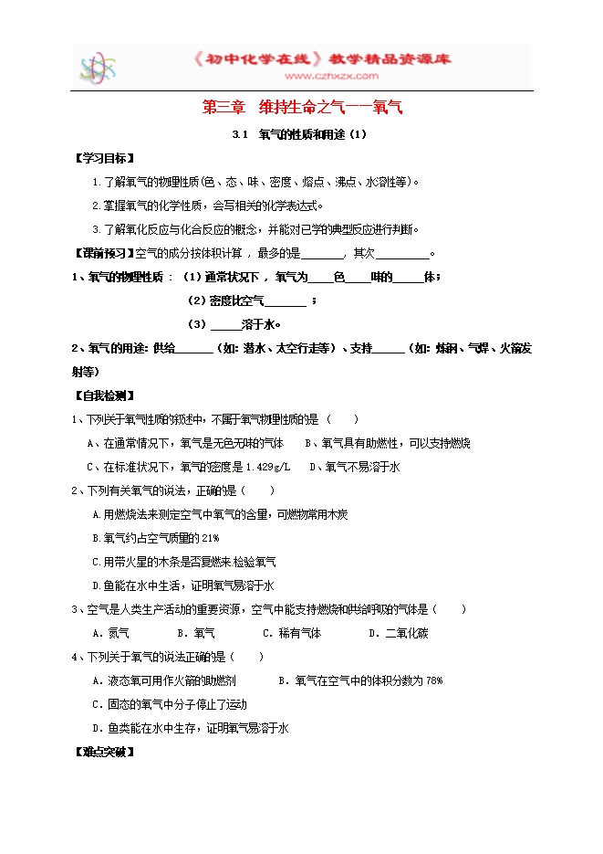 内蒙古鄂尔多斯市东胜区粤教版九年级化学上册《第三章 维持生命之气_氧气3.1 氧气的性质和用途1》学案(word版无答案)