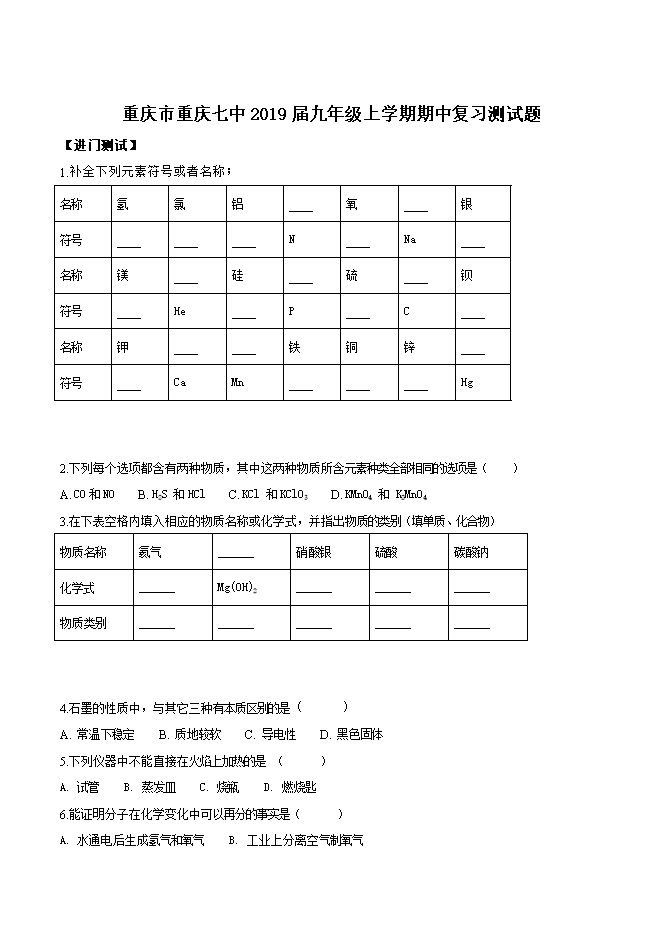 重庆市七中2019届九年级上学期期中复习测试题(word版无答案)