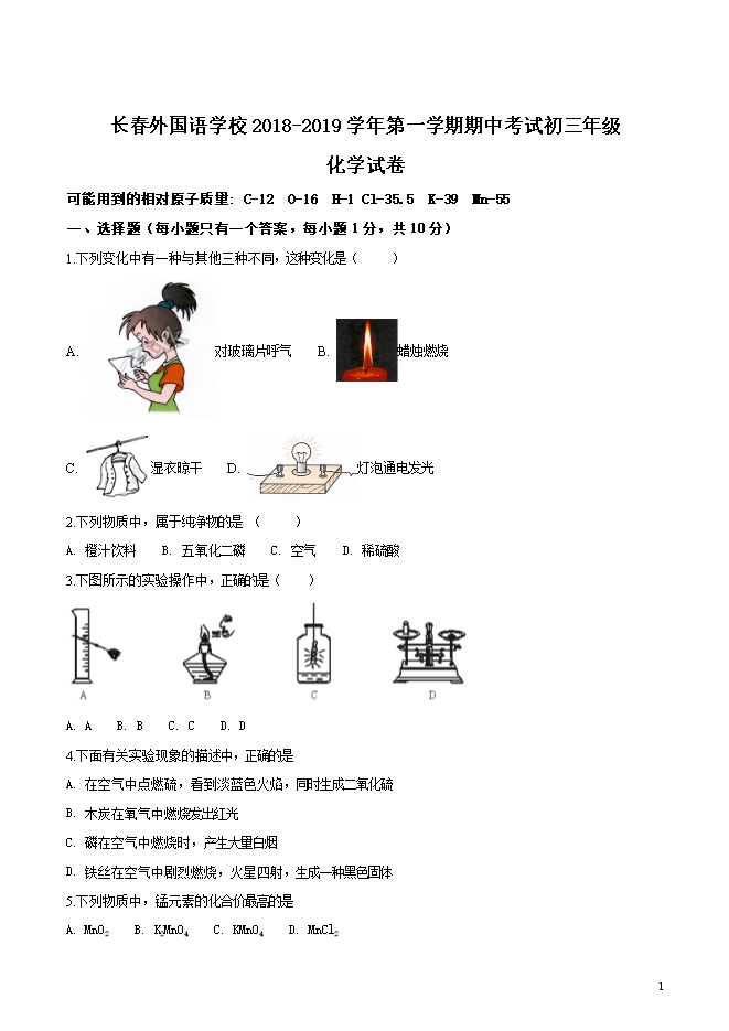 吉林省长春外国语学校2019届九年级上学期期中考试化学试题(word版无答案)