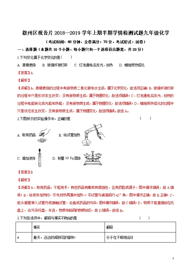 精品解析:四川省宜宾市叙州区观音片区2019届九年级上学期期中考试化学试题(word版含答案解析)