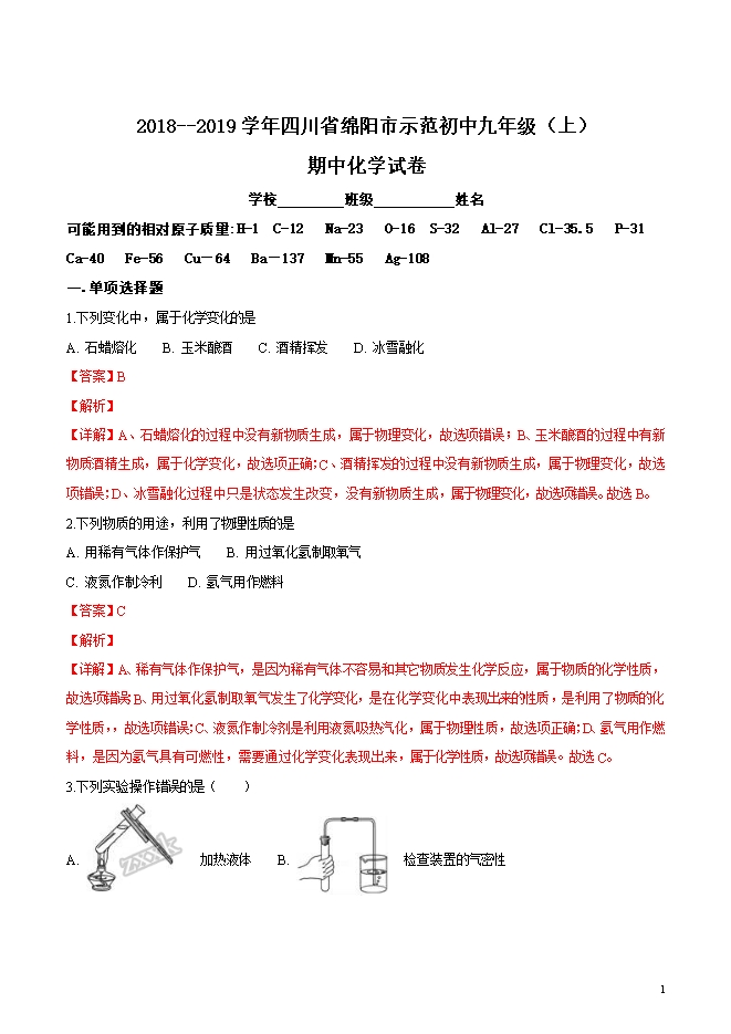 精品解析:四川省绵阳市示范初中2019届九年级上学期期中化学试题(word版含答案解析)