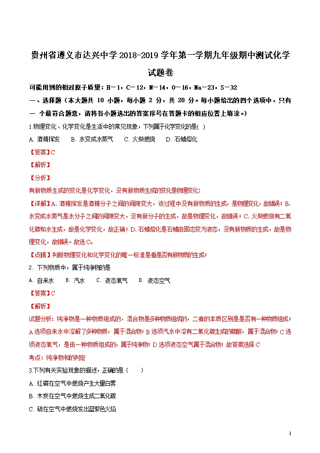 精品解析:贵州省遵义市达兴中学2019届九年级第一学期期中测试化学试题(word版含答案解析)
