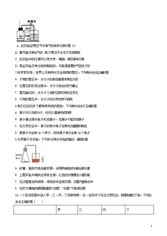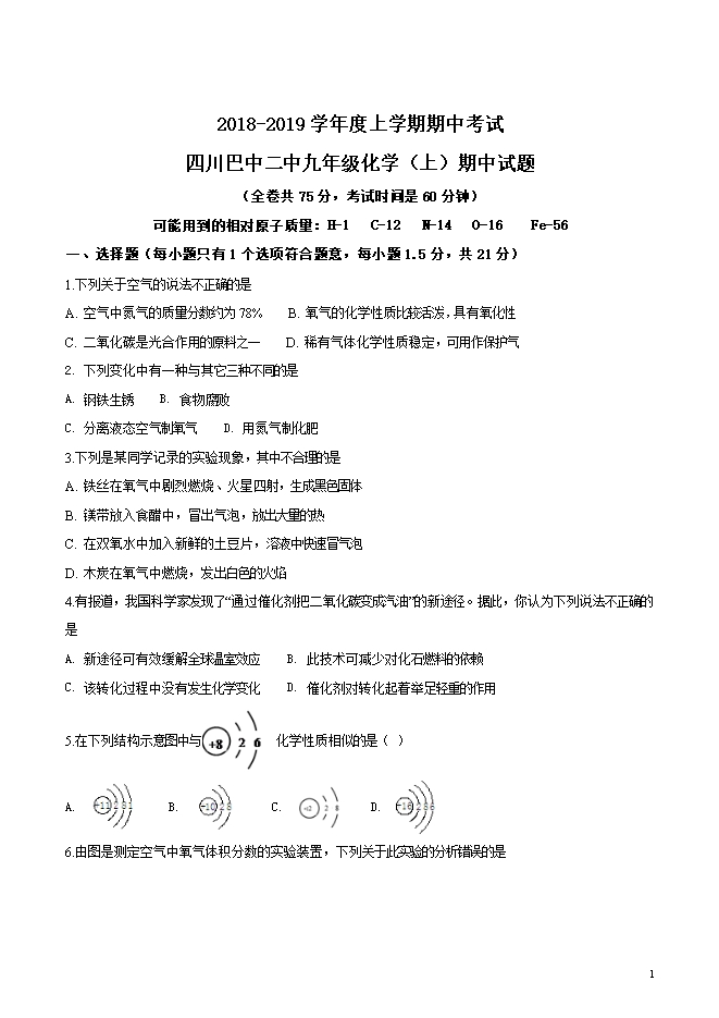 【内容简介】四川省巴中二中2019届九年级上学期期中考试人教版化学试题(word版无答案)