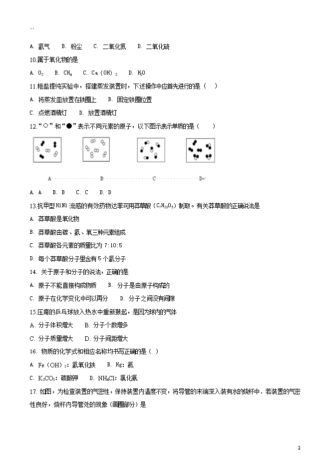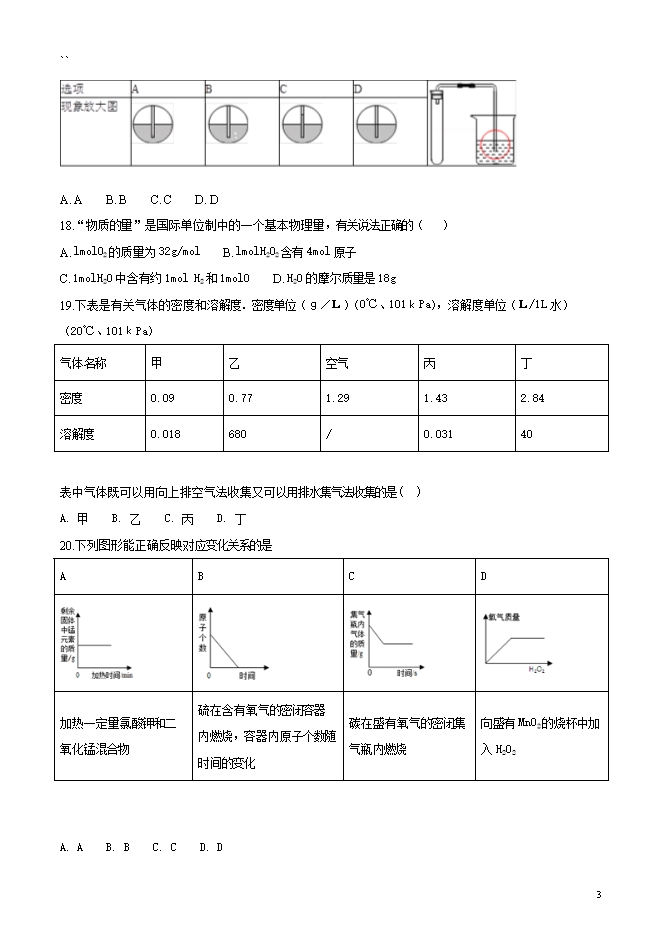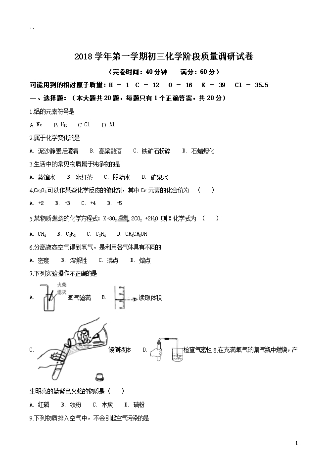【内容简介】上海市浦东新区第一教育署2019届九年级上学期期中考试化学试题(word版无答案)