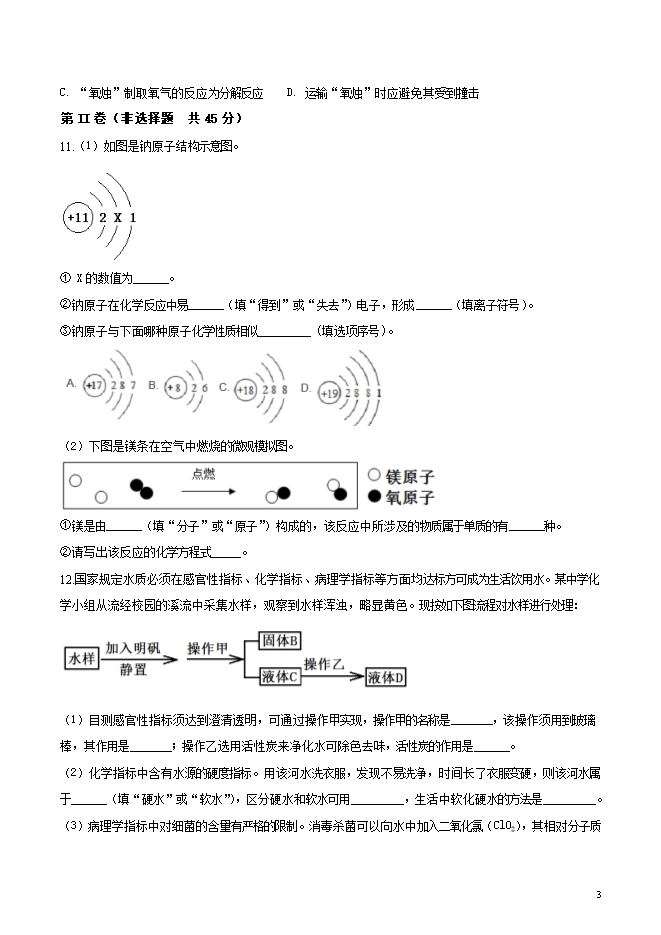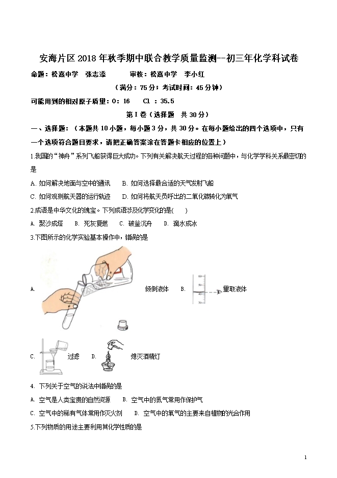 福建省晋江市安海片区2019届九年级上学期期中考试化学试题(word版无答案)