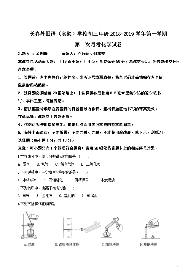 吉林省长春外国语学校2019届九年级上学期第一次月考化学试题(word版无答案)