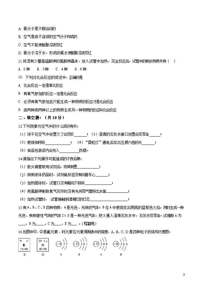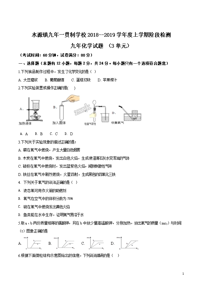 【内容简介】辽宁省大石桥市水源镇九年一贯制学校2019届九年级上学期第一次阶段检测化学试题(word版无答案)
