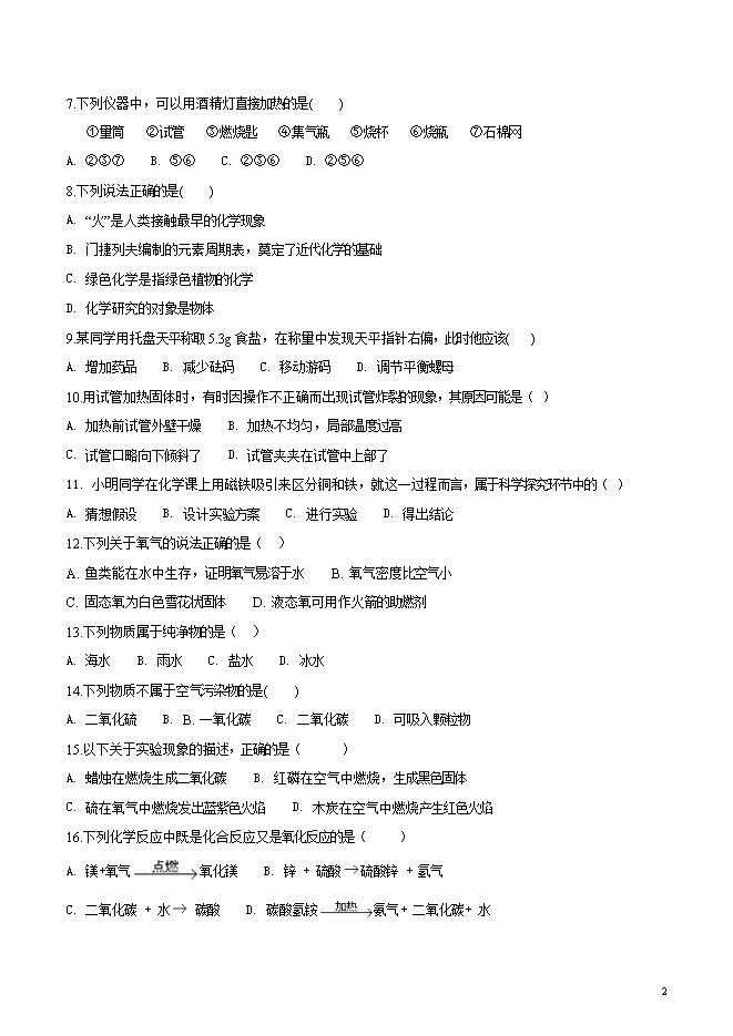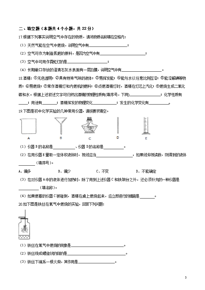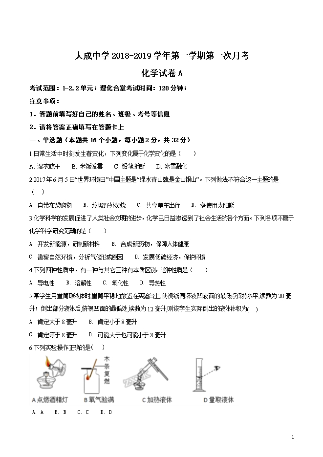 【内容简介】重庆市大成中学2019届九年级第一学期第一次月考化学试题(word版无答案)
