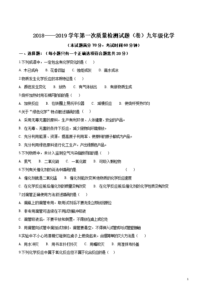 山西省平定县东关中学2019届九年级上学期第一次月考化学试题(word版无答案)