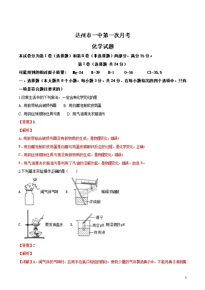 【内容简介】精品解析:四川达州市第一中学2019届初三上学期第一次月考化学试题(word版含答案解析)
