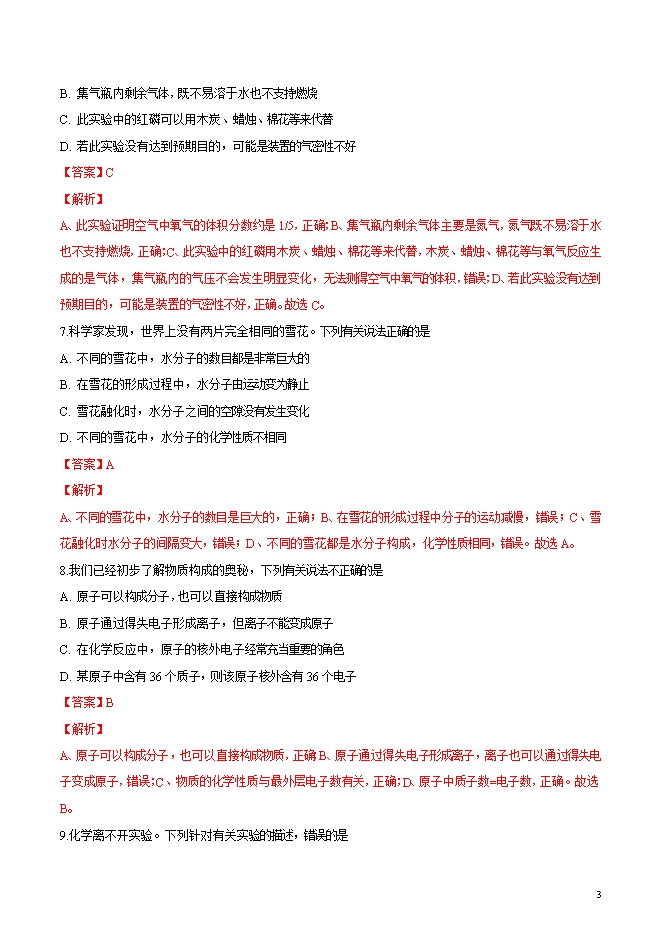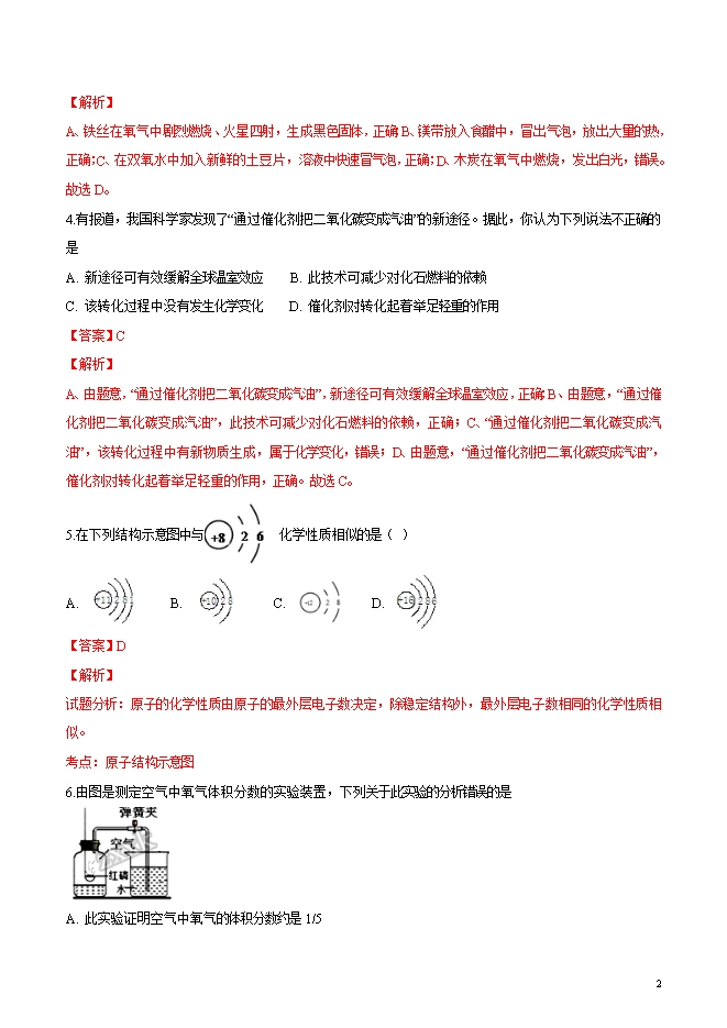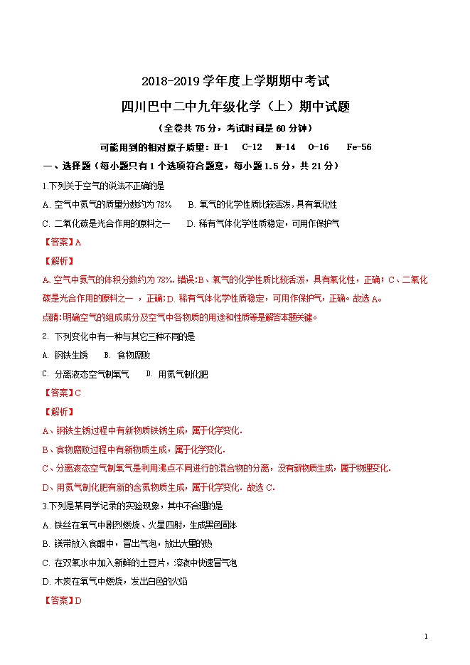 精品解析:四川省巴中二中2019届九年级上学期期中考试化学试题(word版含答案解析)