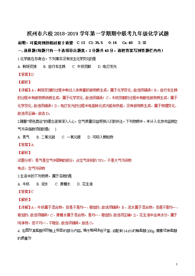 精品解析:山东省滨州市六校2018-2019学年第一学期期中联考九年级化学试题(word版含答案解析)