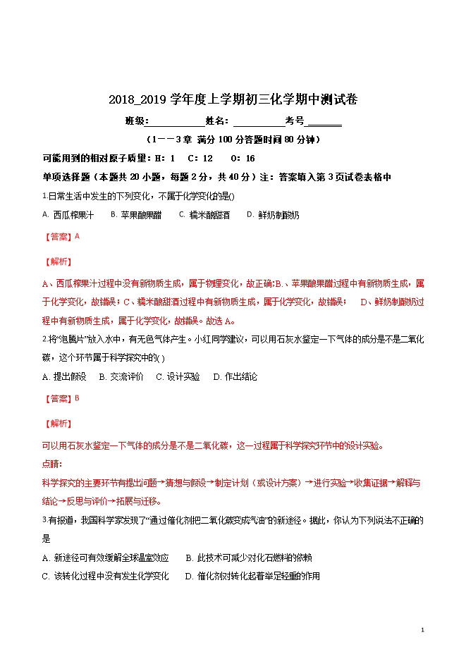 精品解析:内蒙古翁牛特旗乌丹第一中学2019届九年级上学期期中考试化学试题(word版含答案解析)
