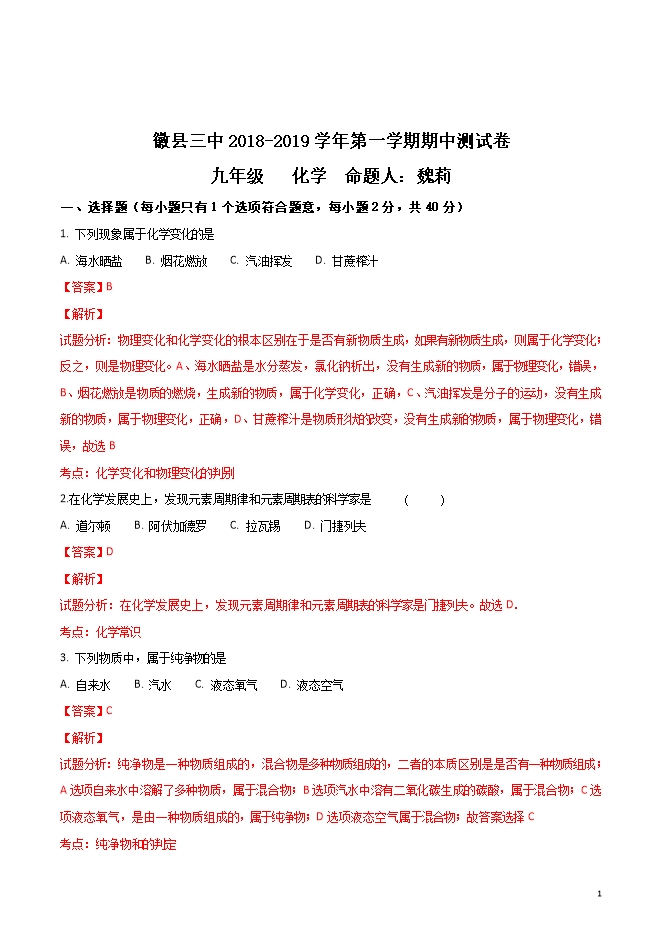 【内容简介】精品解析:甘肃省徽县第三中学2019届九年级上学期期中考试化学试题(word版含答案解析)