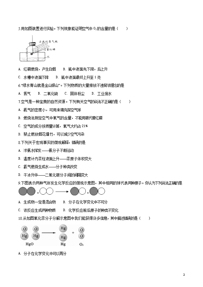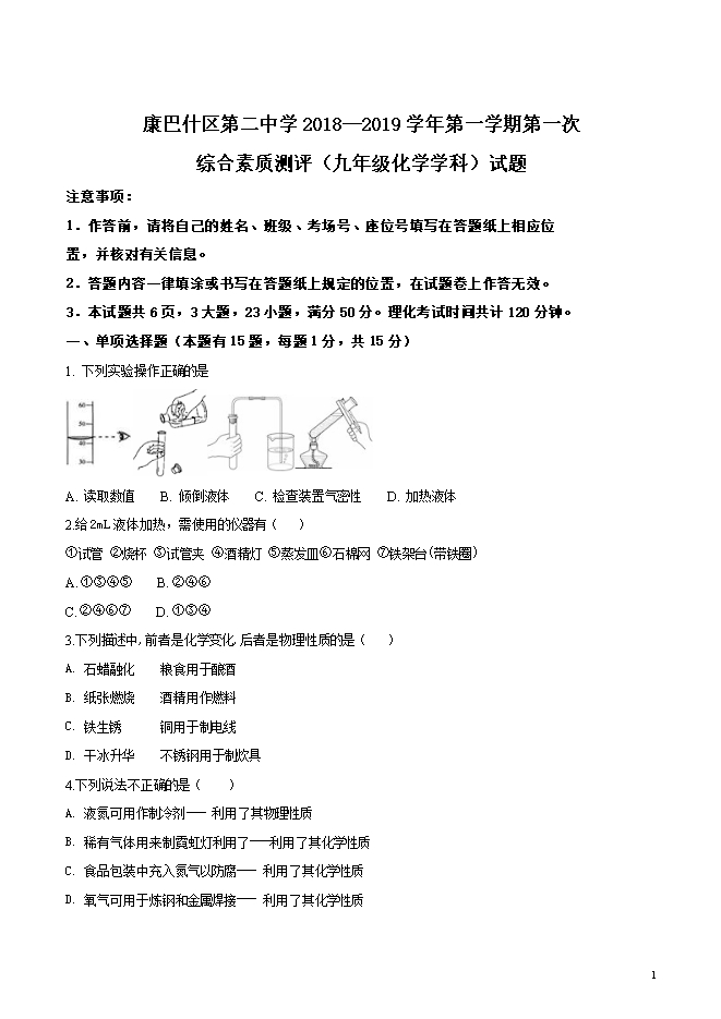 【内容简介】内蒙古鄂尔多斯康巴什新区第二中学2019届九年级上学期第一次月考化学试题(word版无答案)