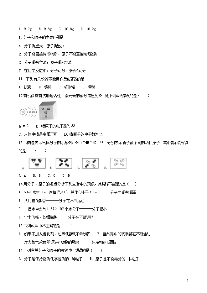 山东省庆云县第二中学2019届九年级上学期第一次月考化学试题(word版无答案)