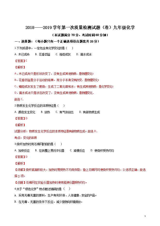 精品解析:山西省平定县东关中学2019届九年级上学期第一次月考化学试题(word版含答案解析)