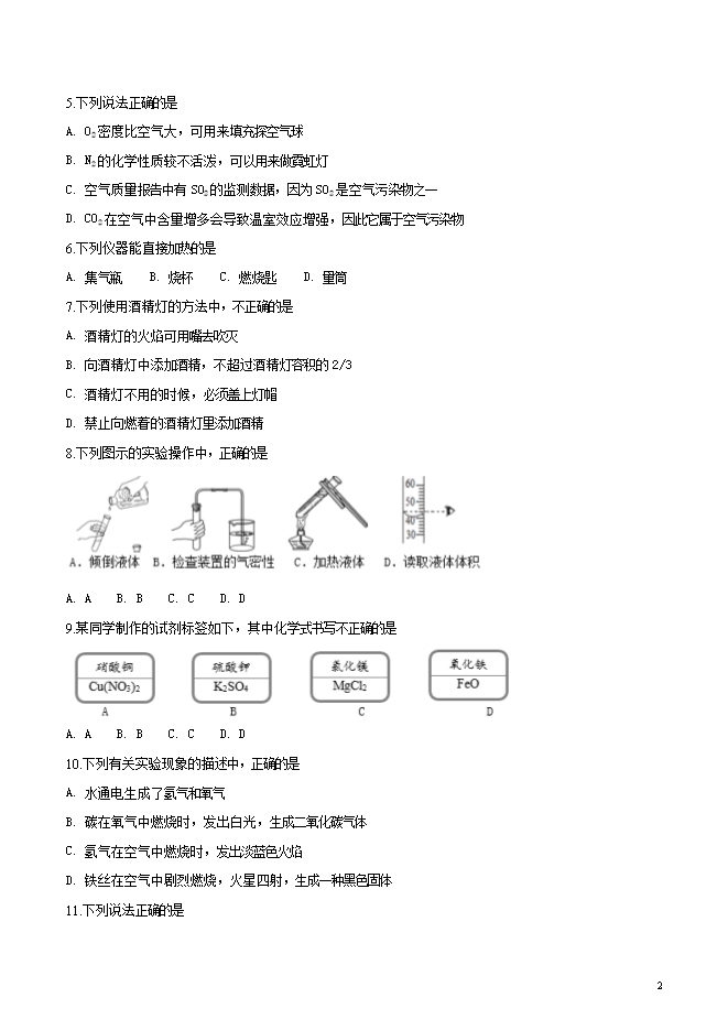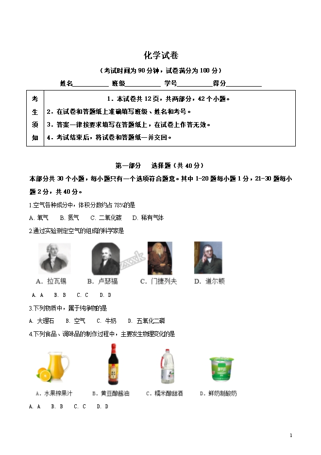 【内容简介】北京市北京四中2019届九年级第一学期期中考试化学试卷(word版无答案)