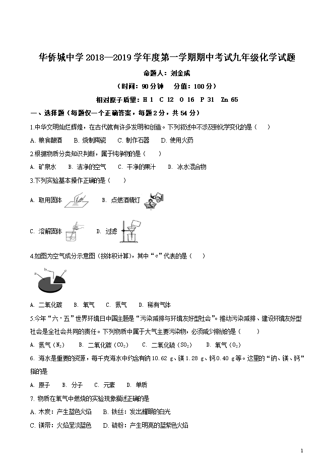 【内容简介】广东省深圳市南山区华侨城中学2018—2019学年度第一学期期中考试 九年级 化学试题(word版无答案)