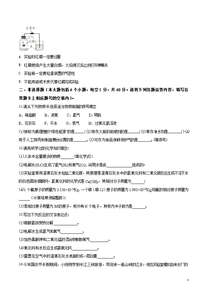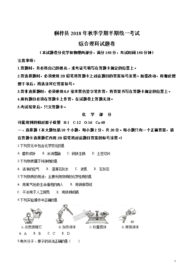 【内容简介】贵州省遵义市桐梓县2019届九年级上学期期中(半期)考试化学试题(word版无答案)