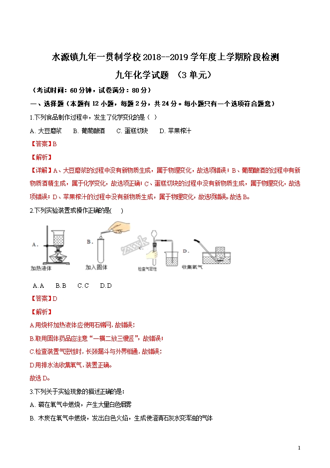 【内容简介】精品解析:辽宁省大石桥市水源镇九年一贯制学校2019届九年级上学期第一次阶段检测化学试题(word版含答案解析)