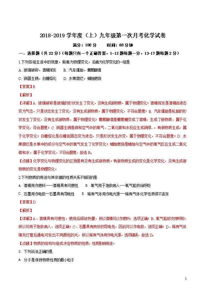 精品解析:辽宁省丹东市第七中学2019届九年级上学期第一次月考化学试题(word版含答案解析)