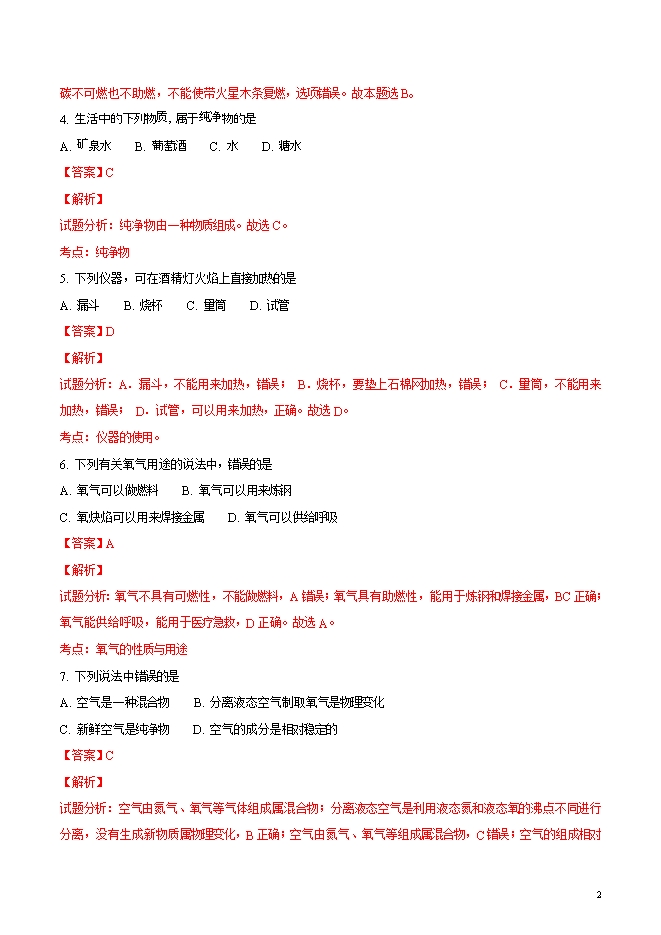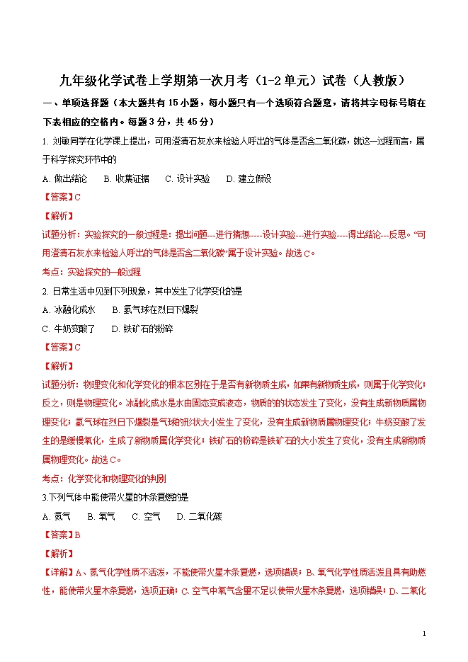 【内容简介】精品解析:河南省郑州市第九十二中学2019届九年级人教版化学上册第一次月考化学试题(word版含答案解析)