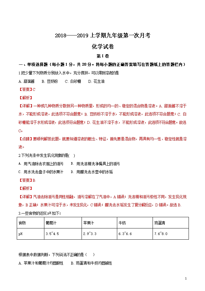 精品解析:山东省泰安市岱岳区满庄一中2019届九年级第一学期第一次月考化学试题(word版含答案解析)